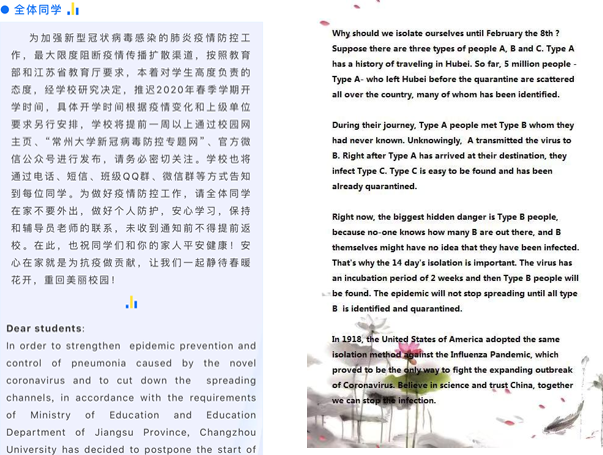 国际交流处、海外教育学院在学校疫情防控工作领导小组统一部署下,第一时间成立留学生疫情防控工作小组,结合学校留学生的实际情况,制定出台了《常州大学留学生疫情防控工作管理专项预案》,发布了《进一步加强常州大学留学生疫情防控工作的通知》。同时,第一时间全面细致地排查在校留学生和外出旅游访友留学生情况,确认在外旅游访友学生所在位置,执行24小时行程动向跟踪。