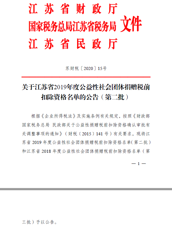 2020年5月20日,江苏省财政局、国家税务总局江苏省税务局、江苏省民政厅发文公布了江苏省2019年度公益性社会团体捐赠税前扣除资格名单(《关于江苏省2019年度公益性社会团体捐赠税前扣除资格名单的公告》苏财税(2020)15号)。常州大学教育发展基金会获得公益性捐赠税前扣除资格。
