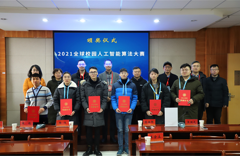 根据学会安排,叶飞跃宣读了2021DIGIX全球校园AI算法精英大赛总决赛中我校师生获奖名单,常大CVPR一队(林龙、孙博言、曹体唱)和常大CVPR二队(欣子浩、田珍珍、殷佳雨、王宝露)获大赛一等奖,常大CVPR三队(孙明浩、冯尊登、蔡坪元)获大赛二等奖。陈海群为获奖师生颁奖。
