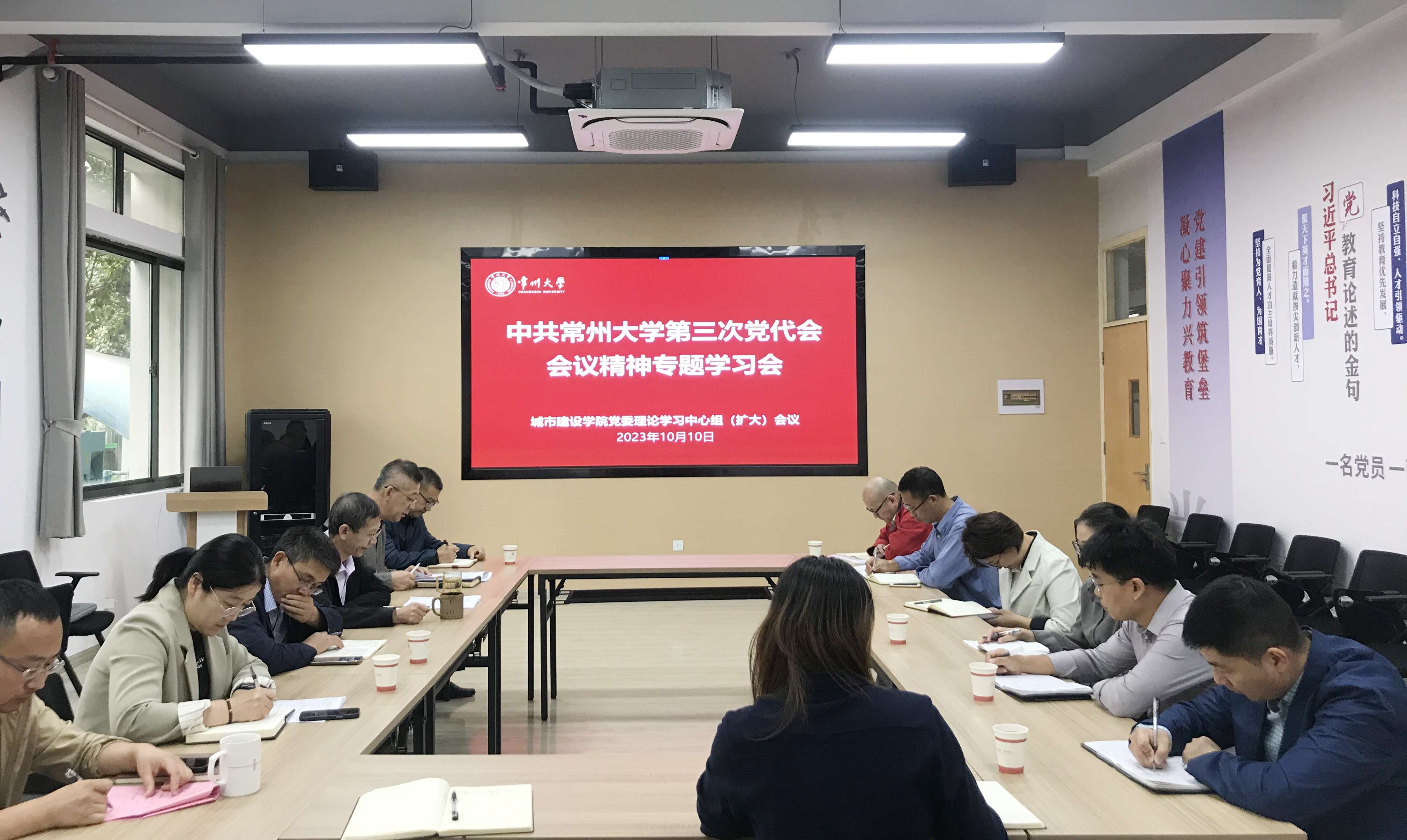 10月10日上午,城市建设学院党委在科教城校区明行楼119室召开中国共产党常州大学第三次党代会精神专题学习会。党委书记乔元明传达了校第三次党代会精神,带领与会人员学习党委书记徐守坤所作的《牢记嘱托走在前 感恩奋进做示范 奋力谱写特色鲜明的高水平地方领军型大学新篇章》报告。他要求全体党员深刻学习领会报告精神,坚持高质量党建引领高质量发展,一体化推进“教育、科技、人才”发展战略,落实立德树人根本任务,践行教育强国、科技报国使命,团结带领全院师生员工深化改革、争创一流,奋力谱写特色鲜明的高水平地方领军型大学新篇章。