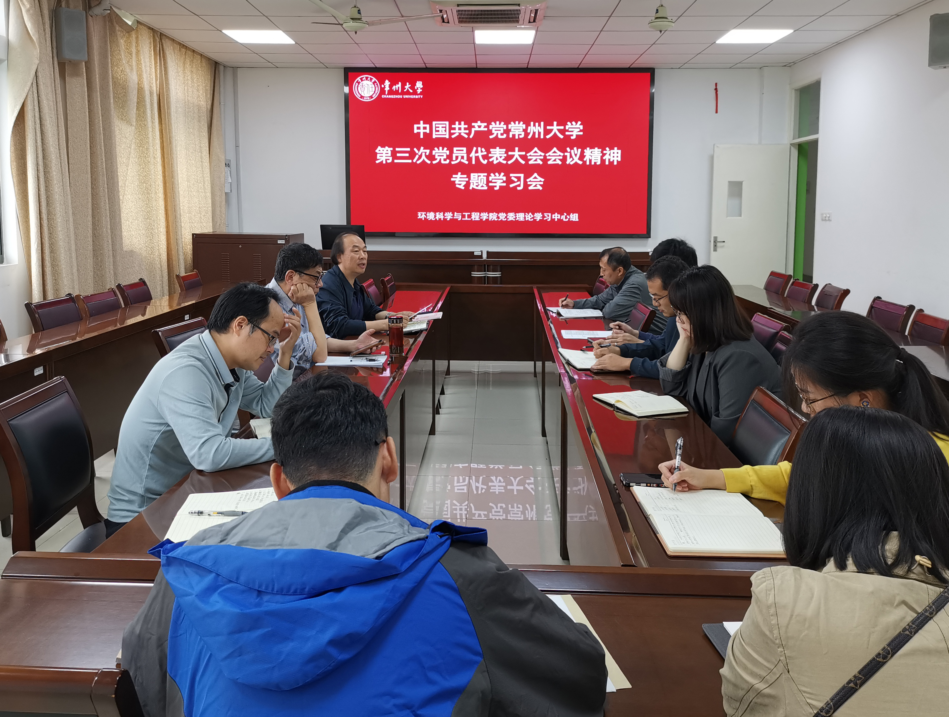 10月7日上午,环境科学与工程学院党委在科教城校区明行楼341室召开中国共产党常州大学第三次党员代表大会精神专题学习会。党委书记薛荣传达了校第三次党代会精神,带领与会人员学习党委书记徐守坤所作的《牢记嘱托走在前 感恩奋进做示范 奋力谱写特色鲜明的高水平地方领军型大学新篇章》报告。他要求全体党员深刻学习领会报告精神,认真践行坚持党的全面领导不动摇,坚持立德树人使命不动摇,坚持服务国家战略不动摇,坚持特色发展方向不动摇,坚持师生至上宗旨不动摇,团结带领全院师生员工紧紧围绕“特色鲜明的高水平地方领军型大学”奋斗目标,努力拼搏、不断进取,在服务江苏“走在前、做示范”的伟大征程中展现常大责任和担当。