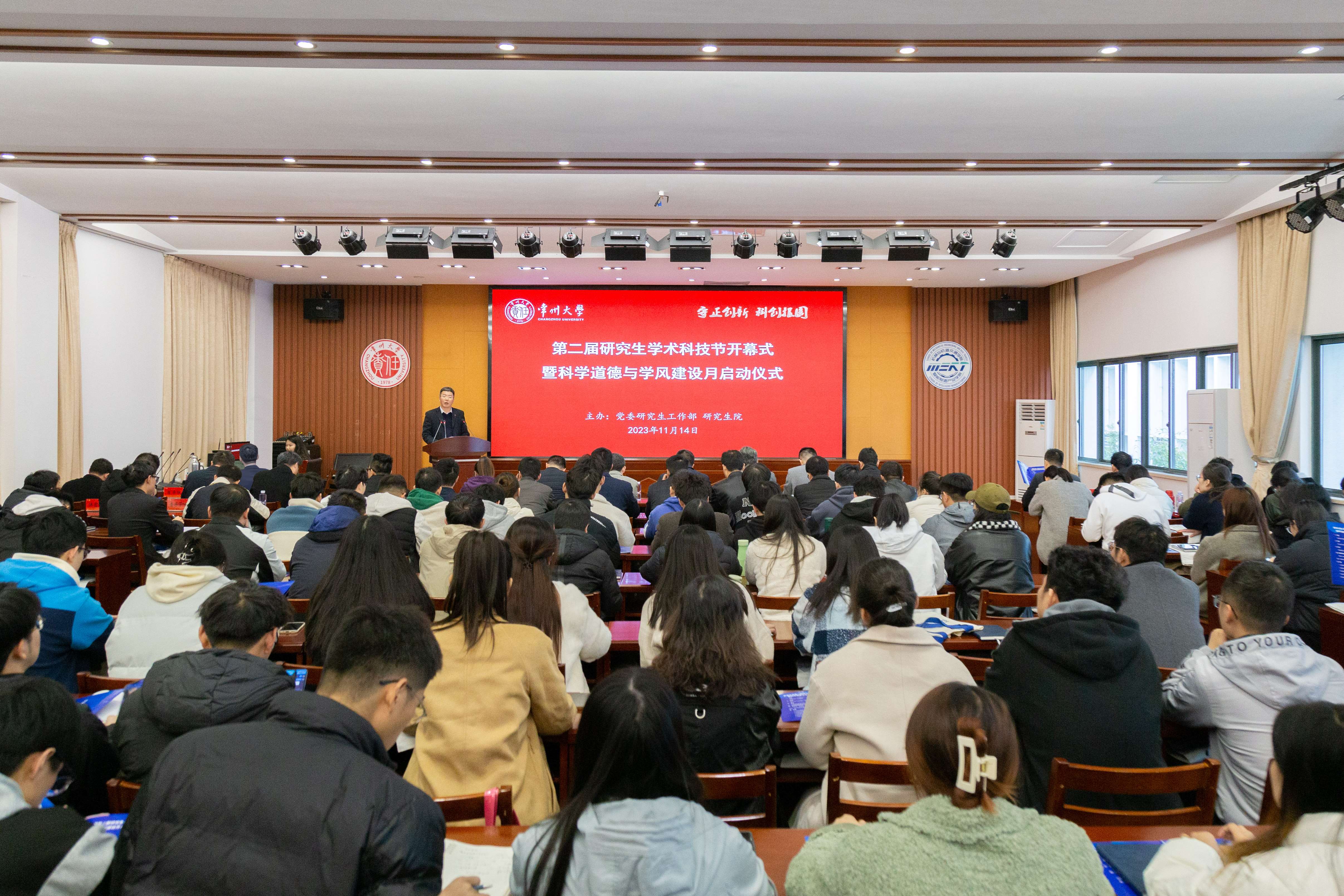 11月14日,“守正创新 科创报国”常州大学第二届研究生学术科技节开幕式暨科学道德与学风建设月启动仪式在科教城校区东区乐行楼243学术报告厅举行。党委常委、副校长李亚飞出席开幕式并致辞。党委宣传部、科技处、产学研合作处、人文社科处、团委、创新创业学院、党委研究工作部、研究生院等相关部门负责人,各培养学院院长、副院长、研究生辅导员及研究生代表140余人参加活动。党委研究生工作部负责人主持开幕式。
