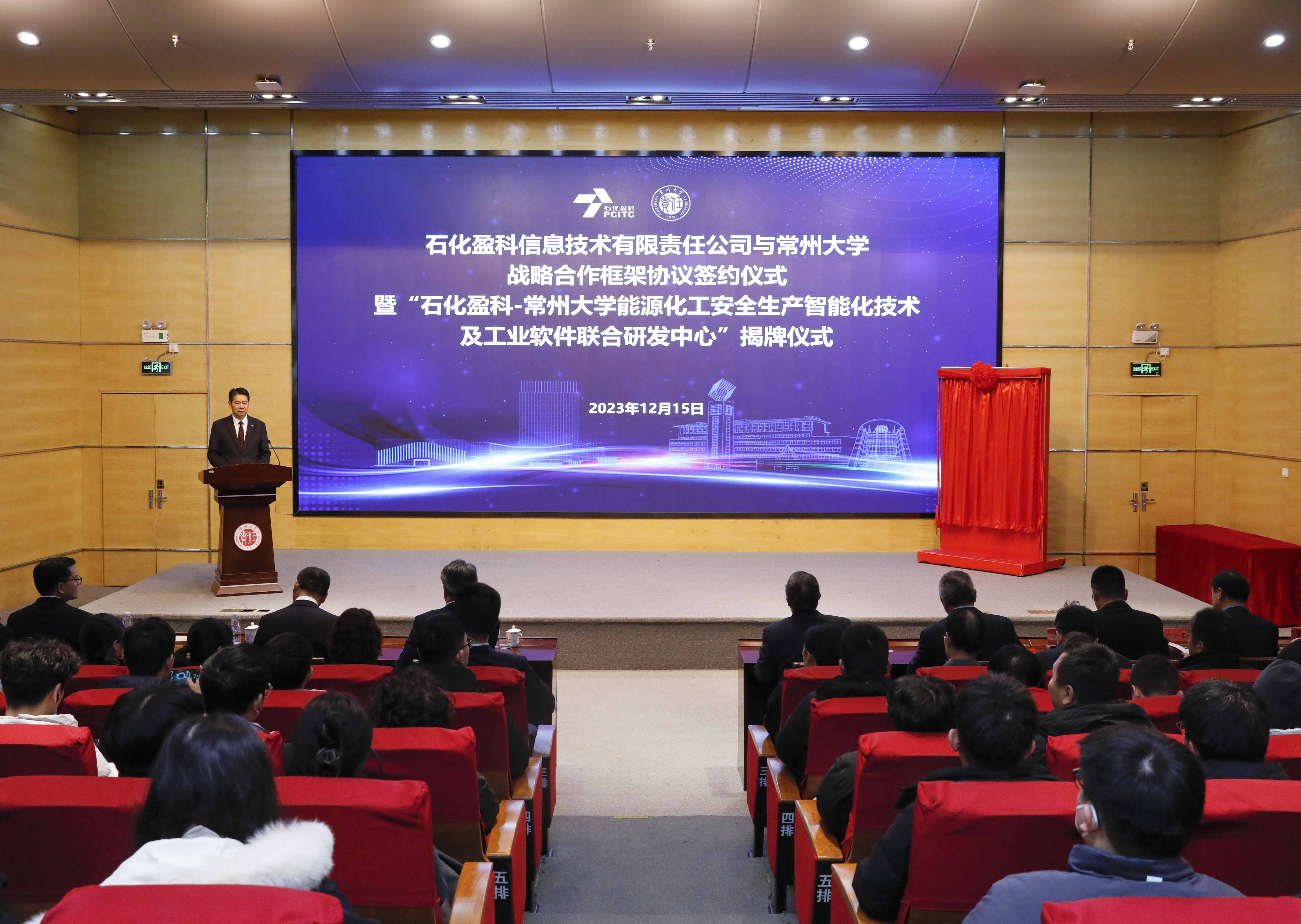12月15日,石化盈科信息技术有限责任公司(以下简称“石化盈科”)与常州大学战略合作框架协议签约仪式暨“石化盈科-常州大学能源化工安全生产智能化技术及工业软件联合研发中心”(以下简称“联合研发中心”)揭牌仪式在常州大学科教城校区文彰楼报告厅举行。石化盈科董事长、党委书记周昌,党委委员、副总裁张刘军,常州大学党委书记徐守坤,原党委书记陈群,党委副书记、校长陈海群,副校长晏成林出席活动。石化盈科人力资源部、企改法律部、华东区域分公司、科技信息部、过程控制事业部,常州大学相关职能部门和学院负责人、教师和学生代表参加活动。陈海群主持活动。