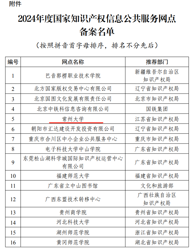 12月20日,国家知识产权局正式公布“2024年度国家知识产权信息公共服务网点名单”,常州大学经江苏省知识产权局推荐成功入选,成为常州地区获批的首家国家知识产权信息公共服务网点。