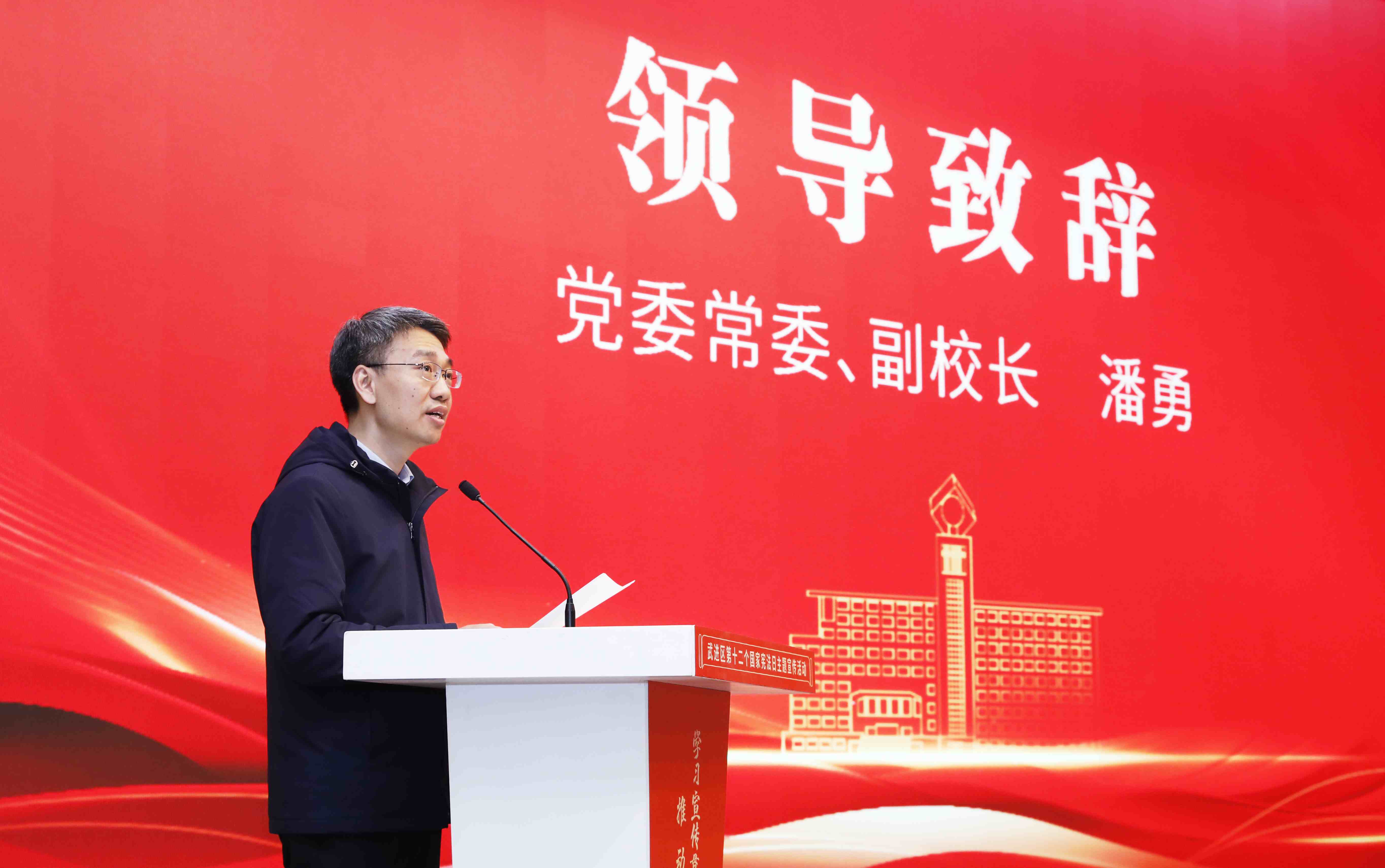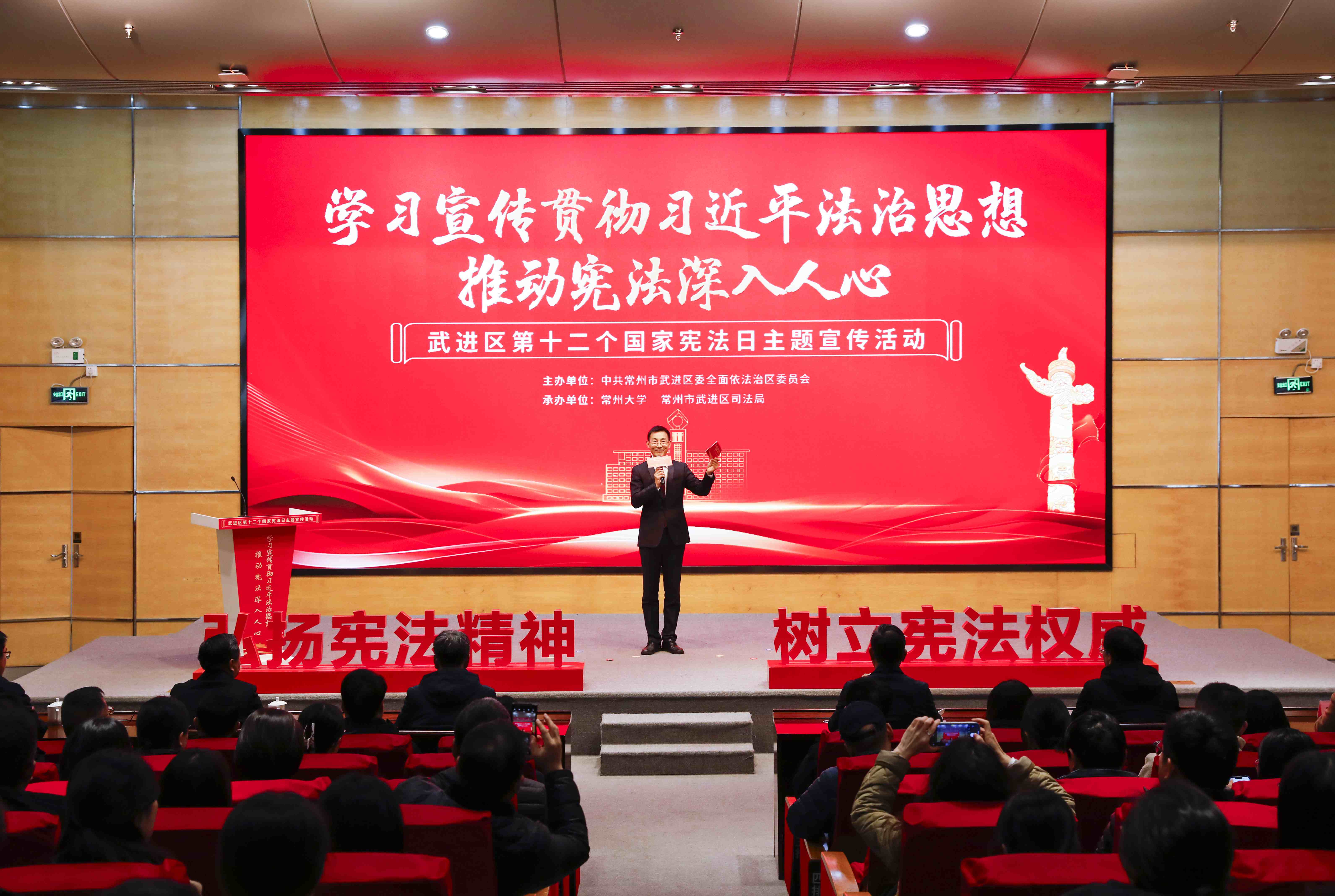 为深入学习宣传贯彻习近平法治思想,推动宪法深入人心,12月4日上午,由中共常州市武进区委全面依法治区委员会主办,常州市武进区司法局和常州大学共同承办的武进区第十二个国家宪法日主题宣传活动在我校科教城校区举行。武进区人民政府副区长盛世麟,常州大学党委常委、副校长潘勇,党委常委、组织部部长秦义,武进区司法局党组书记、局长杨红明,武进区政法系统,各镇(街道)和普法成员单位分管领导,我校相关职能部门负责人及师生代表及常州大学附属小学师生代表参加活动。
