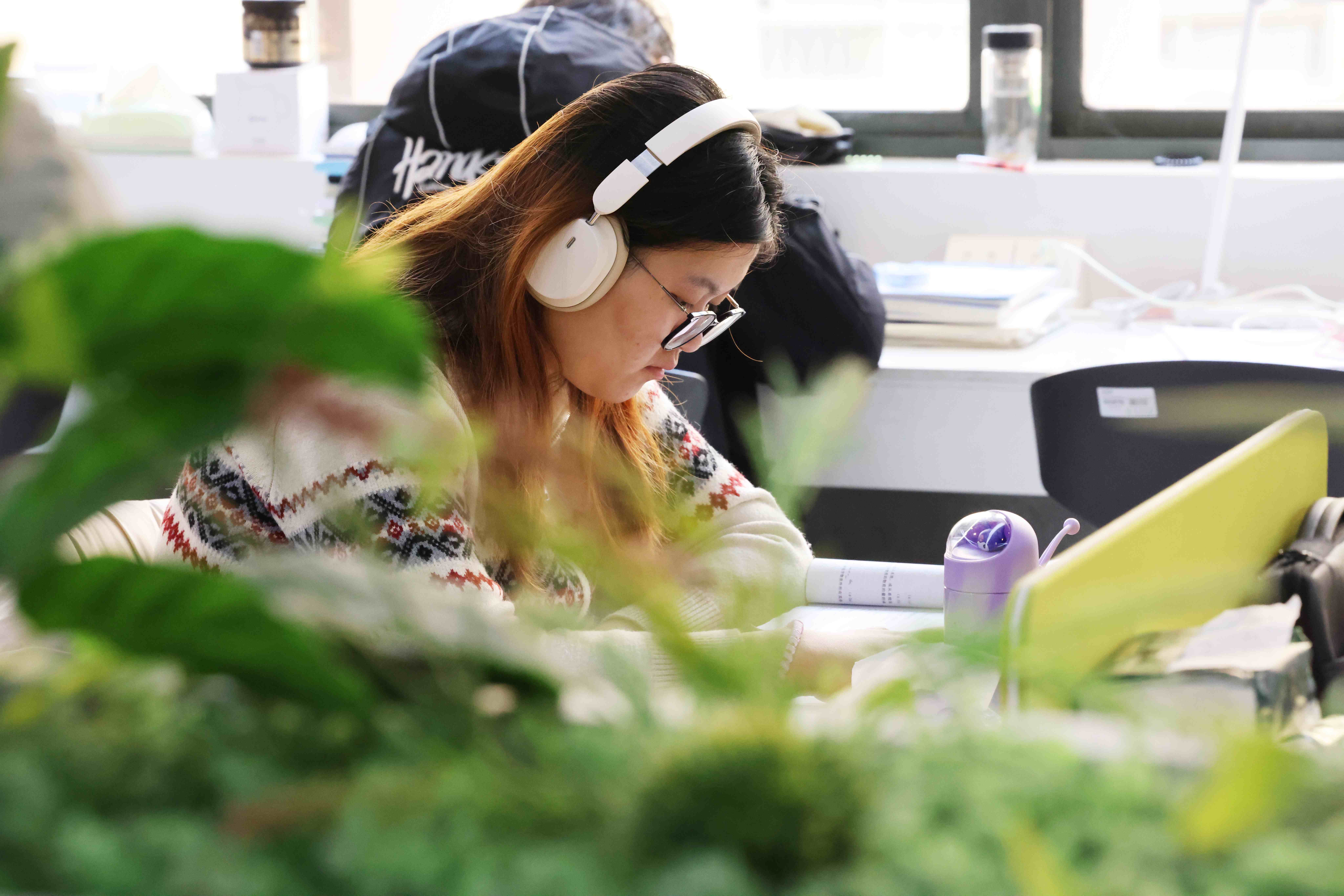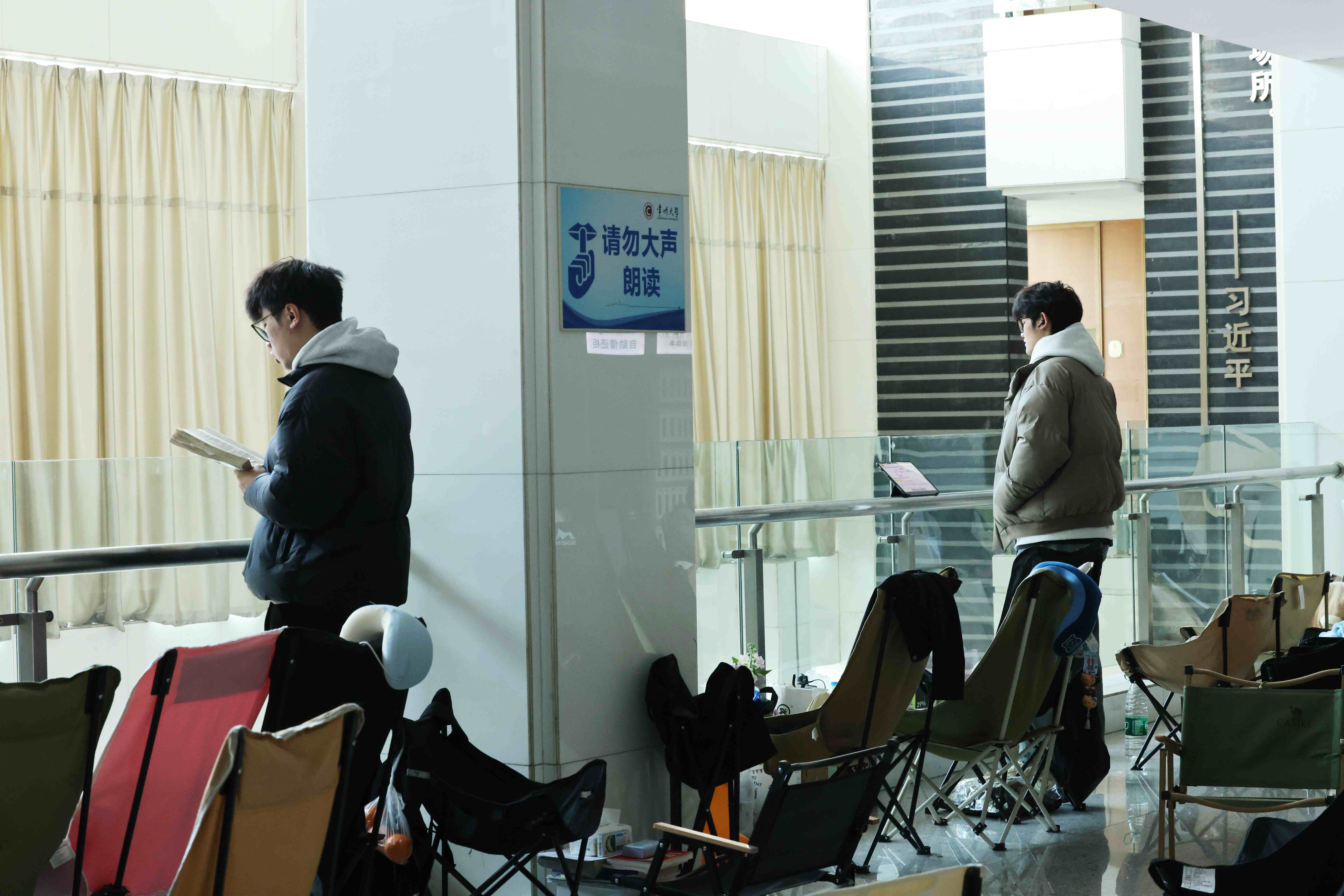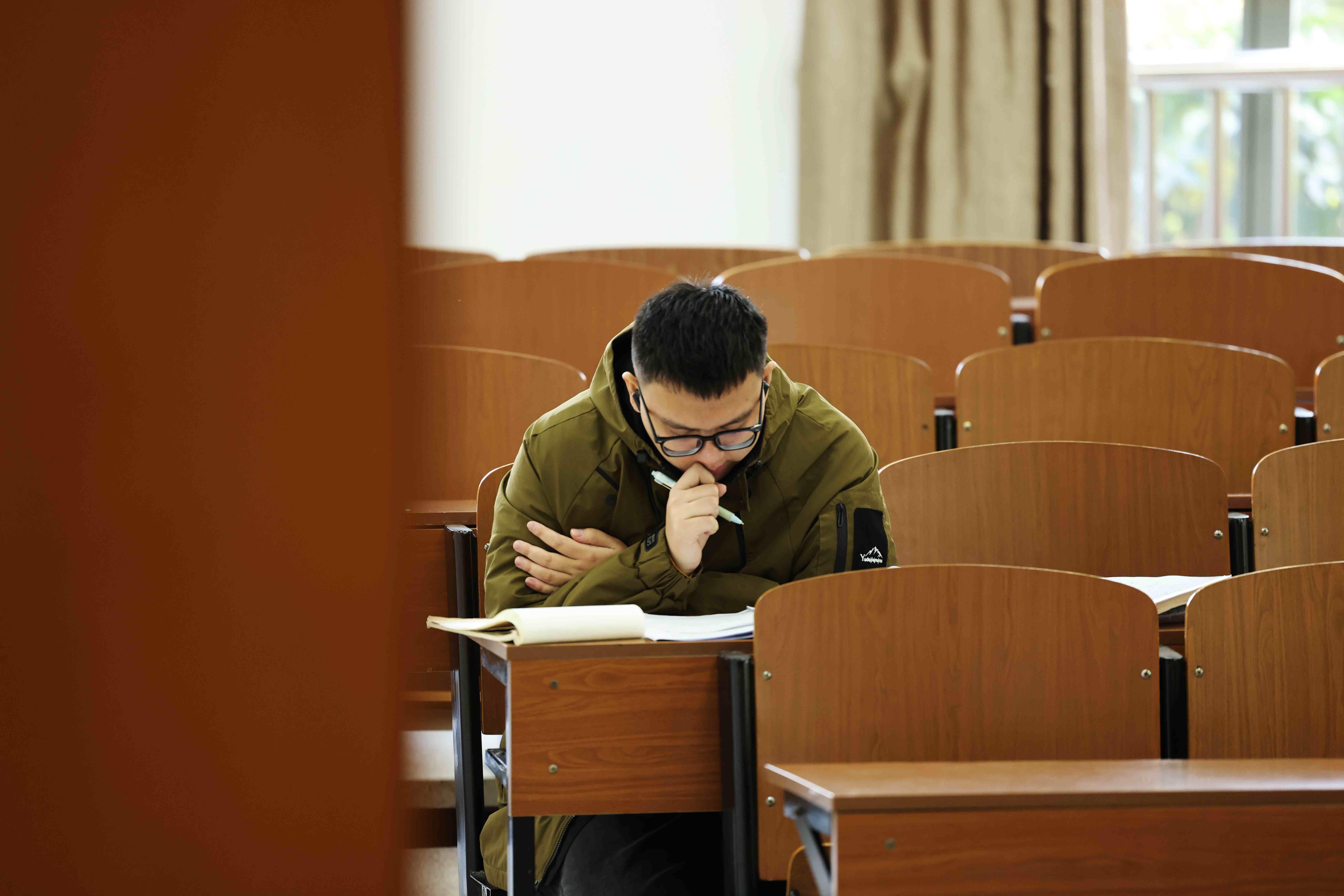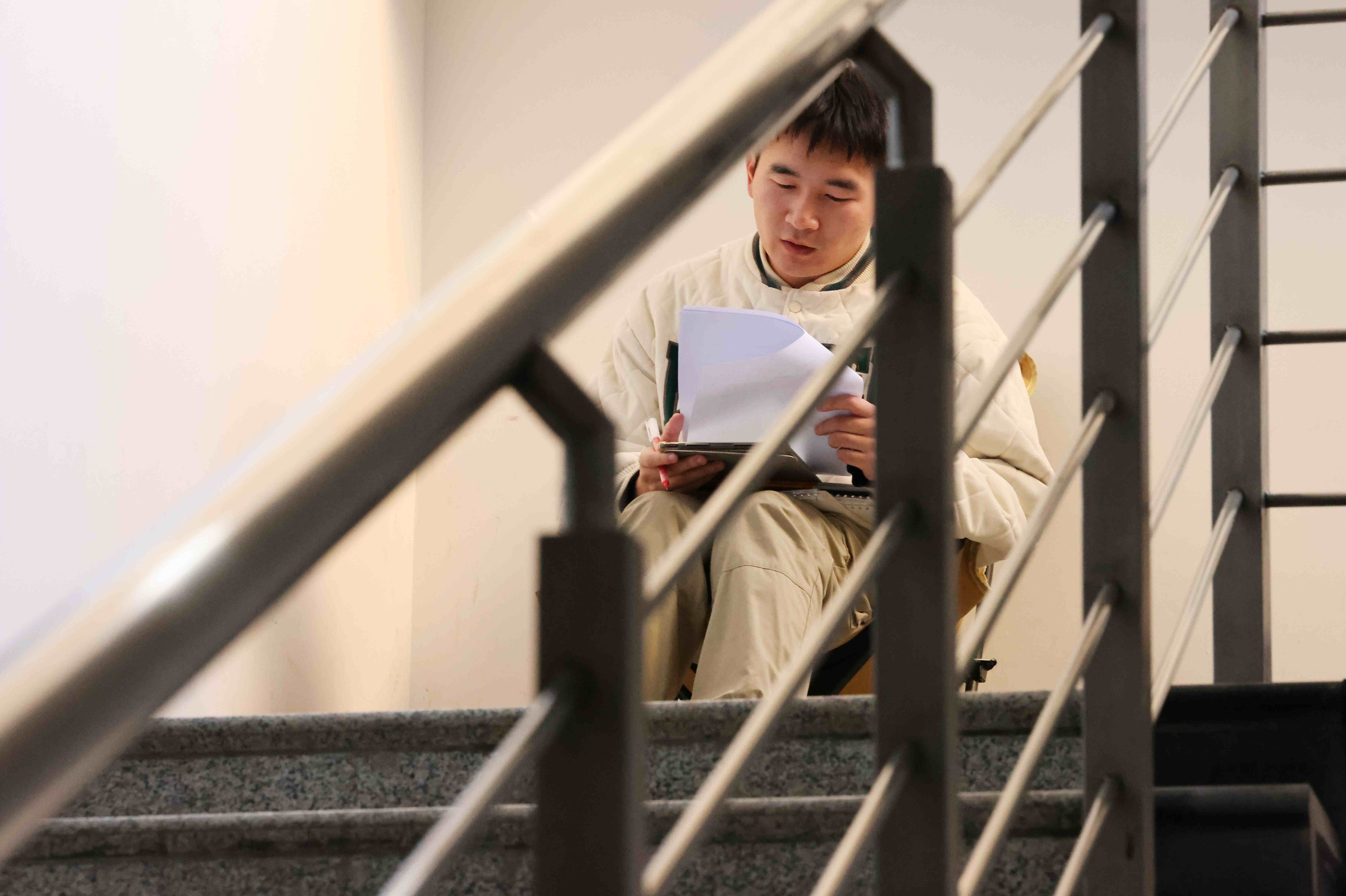 图书馆长廊专注侧影