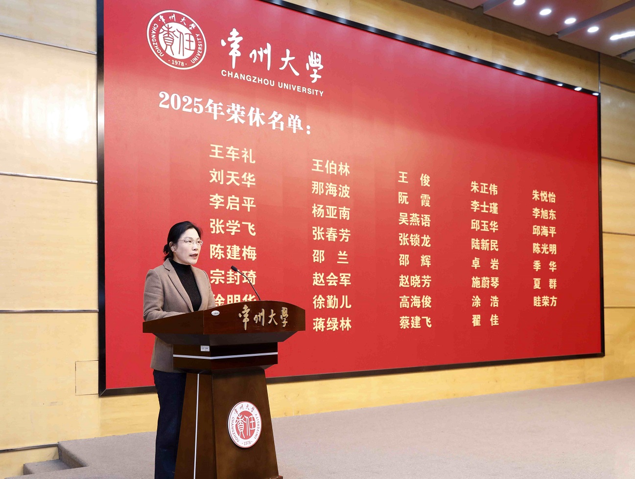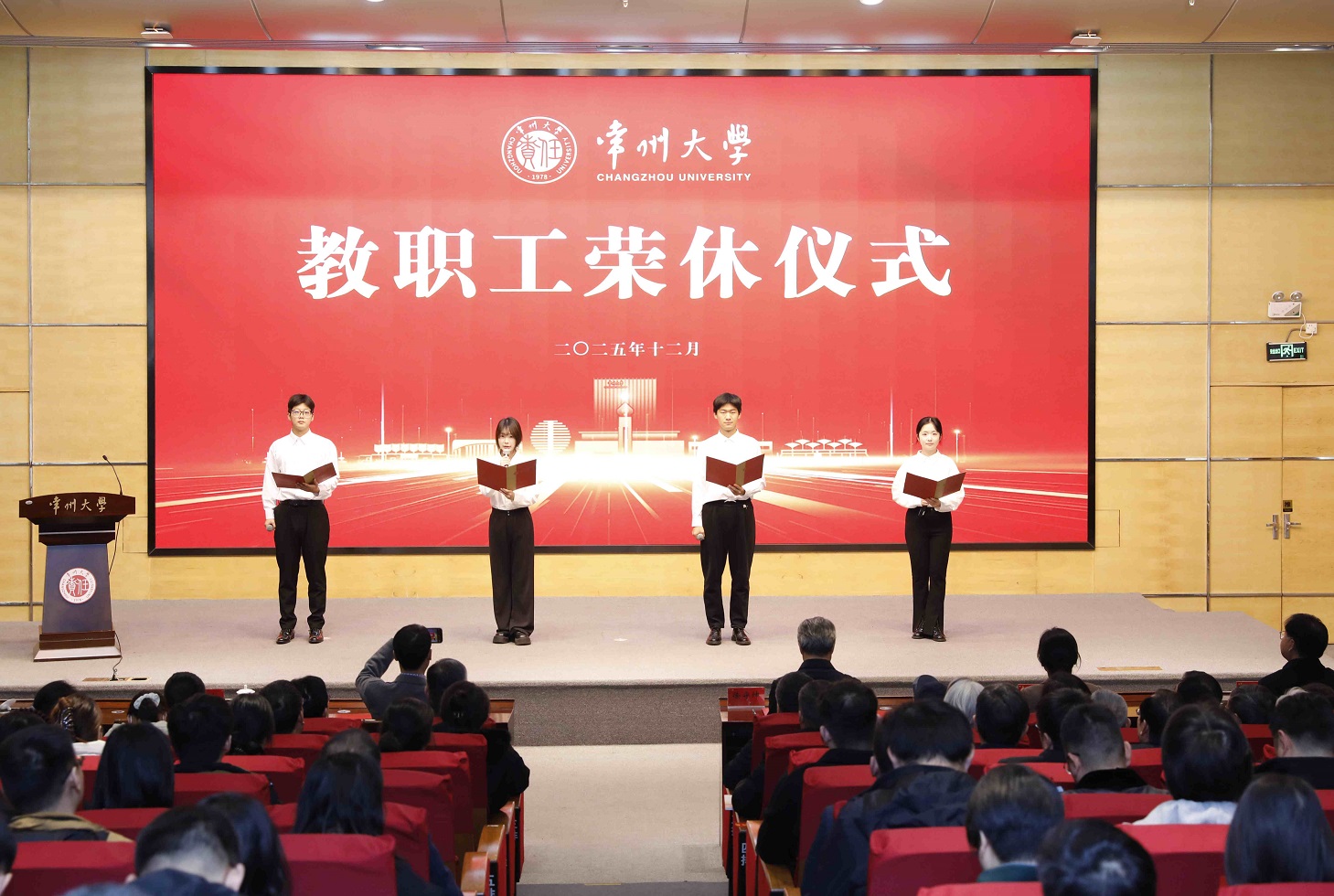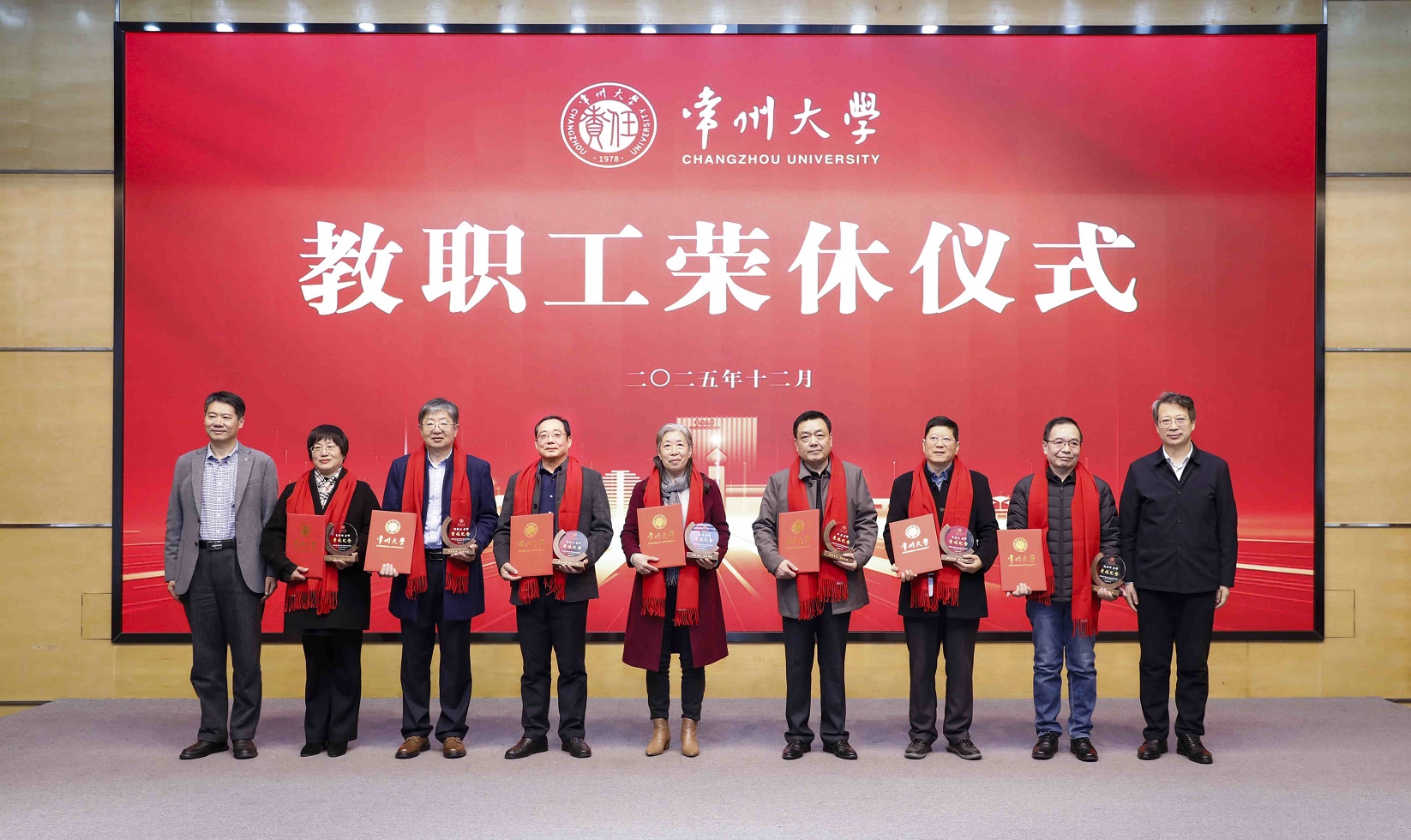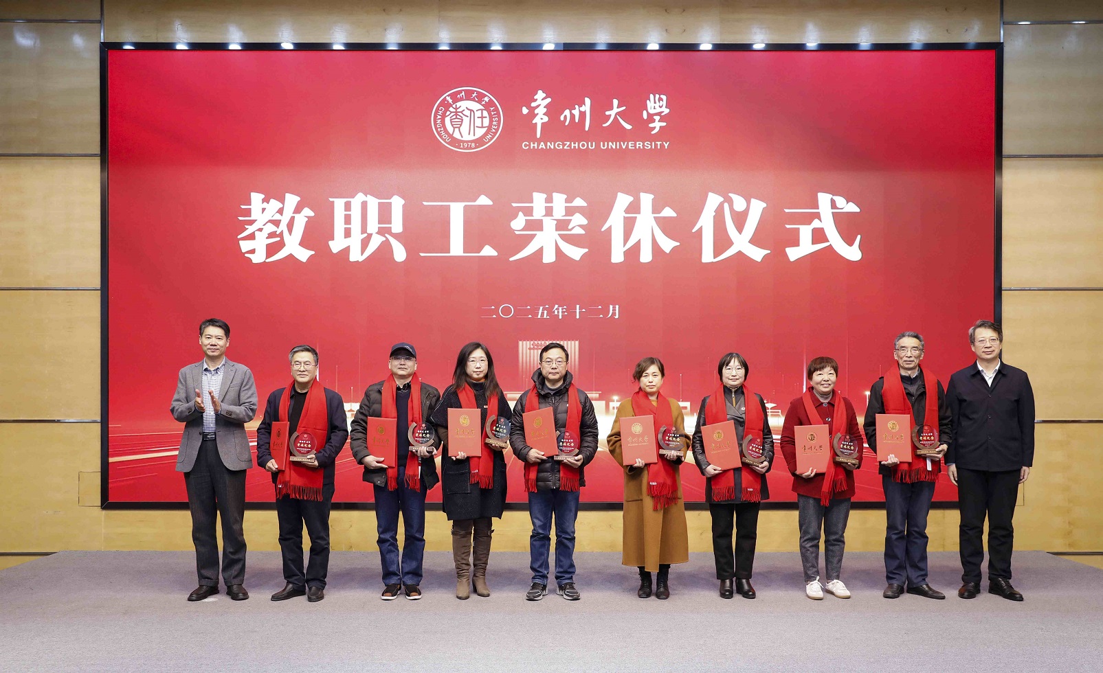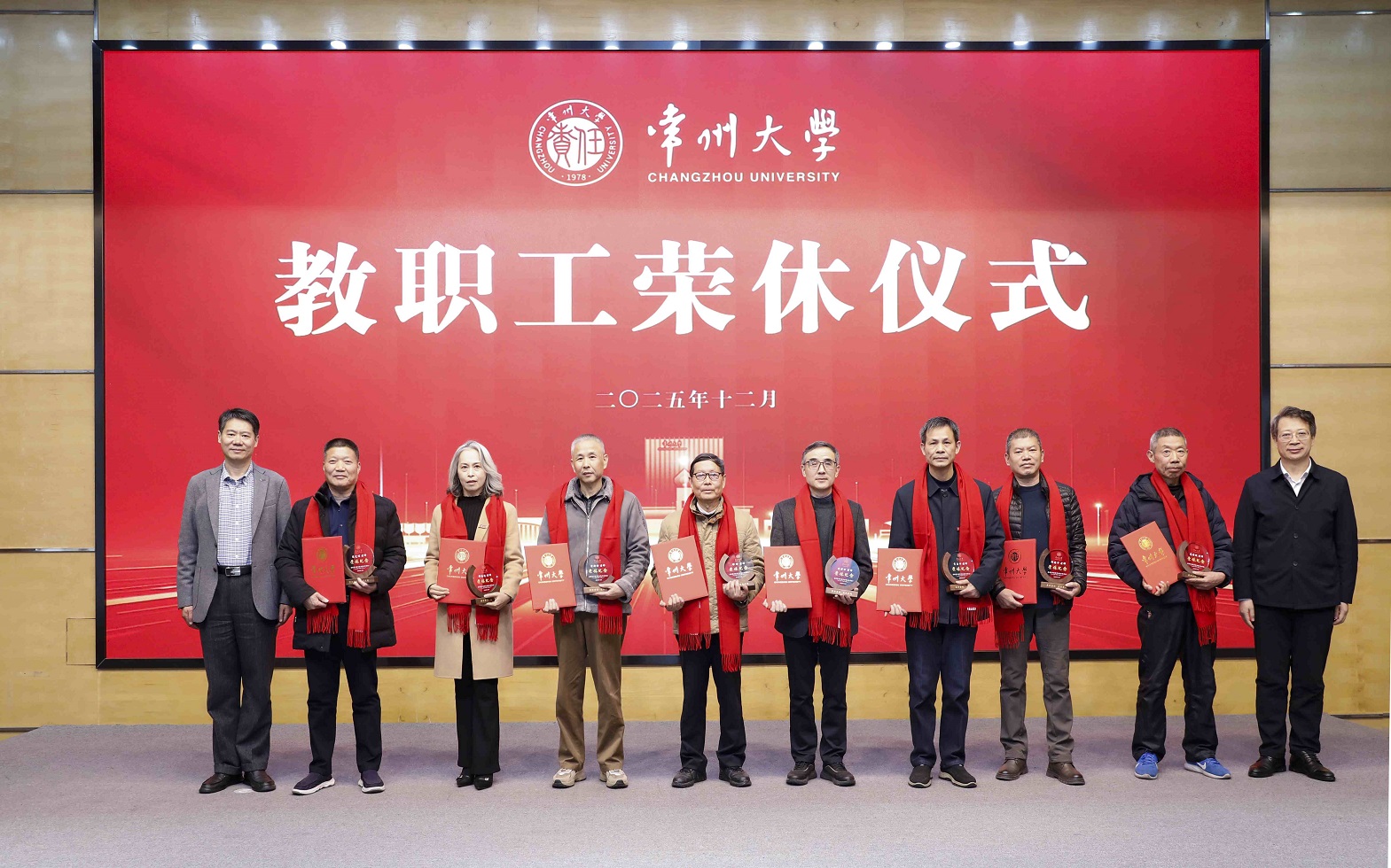 12月19日下午,学校在科教城校区文彰楼报告厅举行2025年常州大学教职工荣休仪式。校领导徐守坤、陈海群、黄海燕、杨琳、李忠玉、周刚、李亚飞、潘勇、吴洪宝出席会议。2025年度荣休教职工、相关职能部门、相关单位负责人、青年教职工代表及学生代表参加会议。杨琳主持会议。