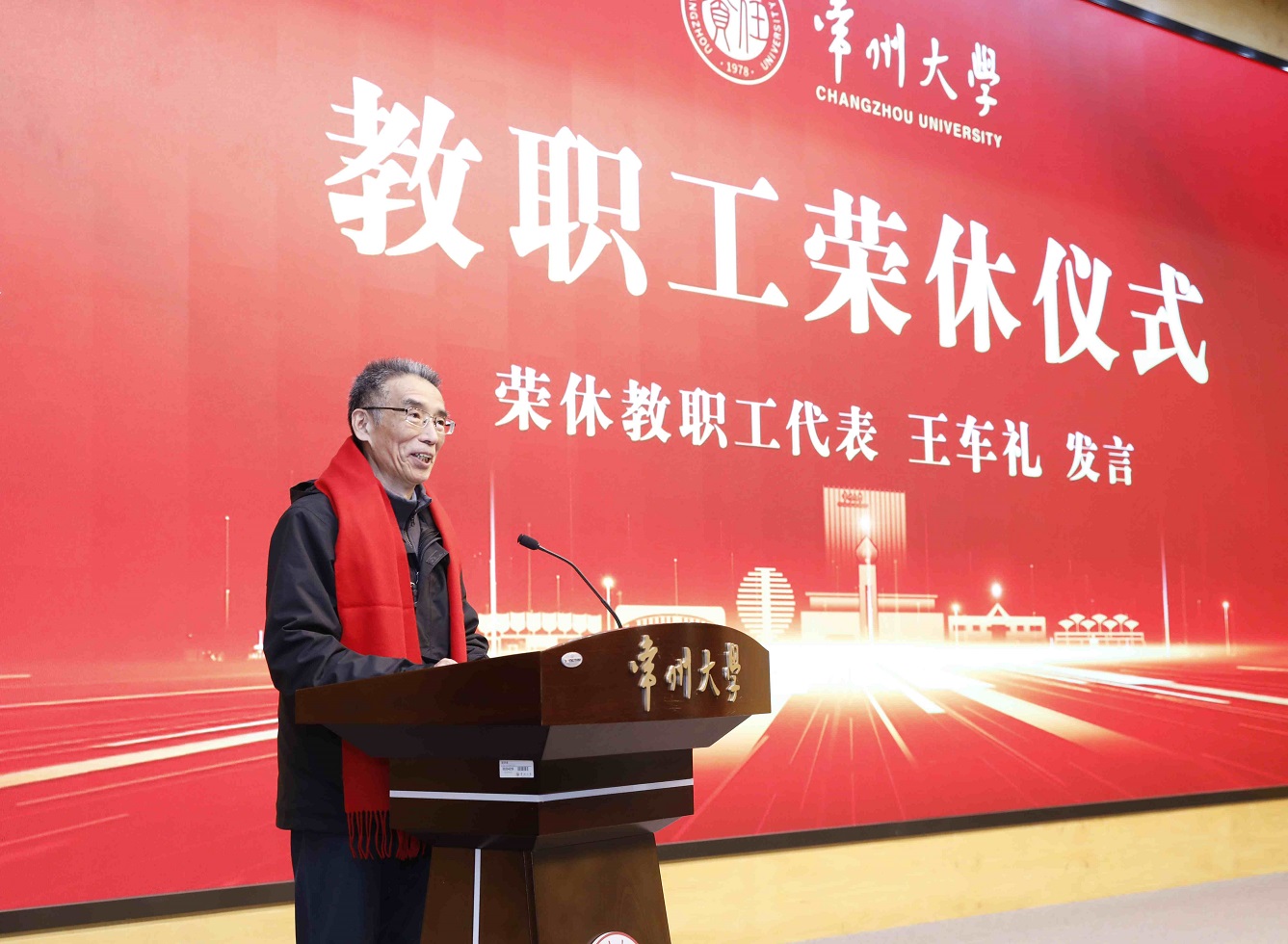 荣休教师代表王车礼回顾了自己在常州大学三十载的工作历程,深情回忆了参与重大项目建设、专业重组与学科发展等难忘经历,并感谢学校与同事们长期以来的支持。他表达了对职业生涯的不舍与热爱,对学生的牵挂和期盼,并表示开启人生新阶段后,还会继续关注学校发展,愿为学校所需贡献余热。